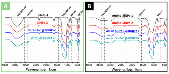 FTIR spectra of (A) unmodified and phenyl-modified silica particles (SiNPs-1, SiNPs-2, Ph-SiNPs-1@BODIPY-1, SiNPs-1@BODIPY-1) and (B) amino-modified silica particles (amino-SiNPs-1, amino-SiNPs-2, amino-SiNPs-1@BODIPY-1, and amino-SiNPs-1@BODIPY-2).