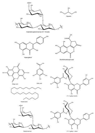 Chemical structures of the main compounds from C. ferrea. Ellagic acid: C14H6O8 and MW: 302.19 g/mol; Gallic acid: C7H6O5 and MW: 170.12 g/mol; Heptacosan: C27H56O and MW: 396.7 g/mol; Galactomannan: C18H32O16 and MW: 504.4g/mol; Kaempferol: C15H10O6 and MW: 286.24 g/mol; 2”-O-Galloylorientin: C28H24O15 and MW: 600.5 g/mol; 2”-O-Galloylvitexin: C28H24O14 and MW: 584.5 g/mol; Glycerol: C3H8O3 and MW: 92.09 g/mol.