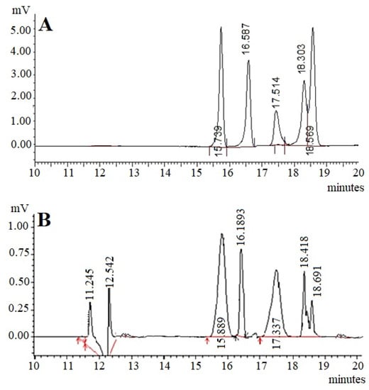 The identification of monosaccharides was carried out using high performance liquid chromatography (HPLC). The polysaccharide hydrolysis was carried out using the method of Zhang and co-workers [34]. The derivatives of monosaccharides were prepared according to the method of Kan and colleagues [35]. The analysis was carried out on a C18 column (4.6 mm × 250 mm, 5 µm) by HPLC (Shimadzu, Japan). The composition of the mobile phase consists of acetonitrile and 0.05 M phosphate buffer (pH = 6.8) (25:75, v/v) at a 1 mL flow rate. The injection volume of 10 µL and the detection was carried out at a wavelength of 245 nm.