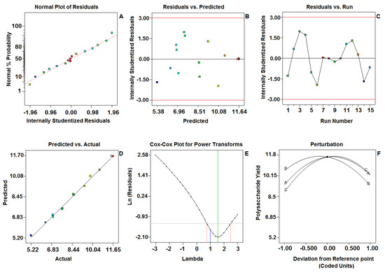 Diagnostic plots for the Box–Behnken model adequacy of the tested variable (predicted vs. actual) against the polysaccharide yield. (A) Normal plot of residuals; (B) Residuals vs. Predicted; (C) Residuals vs. Run; (D) Predicted vs. Actual; (E) Cox-Cox plot for power transforms; (F) Perturbation.