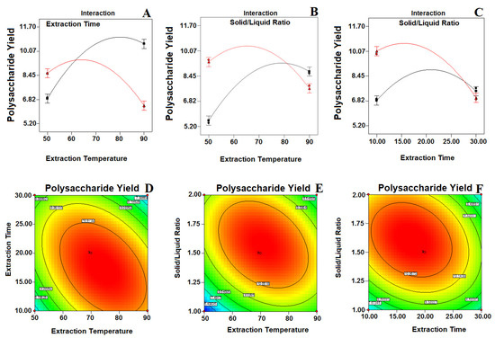 Response surface interaction and contour plots (A,D) showing the effect of the extraction time and extraction temperature; (B,E) solid–liquid ratio and extraction temperature; (C,F) solid liquid ratio and extraction time of the polysaccharide yield. The color intensity (red) in each figure represents the polysaccharide concentration.