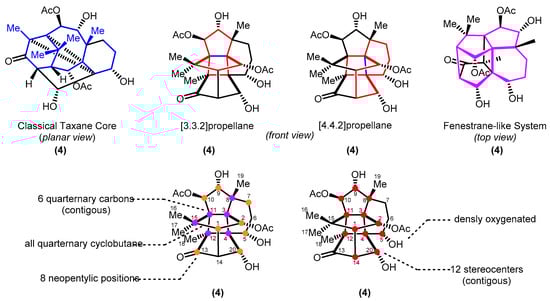 The canataxpropellane (4) features three additional bonds (highlighted in blue) compared to the typical taxane core 1. Two of these additional bonds generate four quaternary stereocenters, and the third bond connects a methyl group to a former secondary carbon (Figure 1).