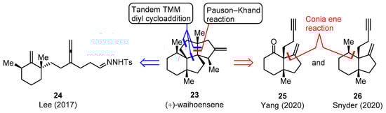 In 2017, the group of Lee was the first to succeed in the total synthesis of the tetracyclic diterpene (±)-waihoensene (23) [4]. In this 18-step synthesis, a tandem cycloaddition proceeding through a trimethylenemethane (TMM) diyl intermediate was employed to build up the angular triquinane moiety of the tetracyclic core.