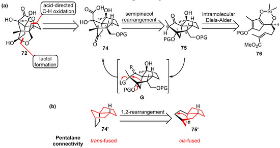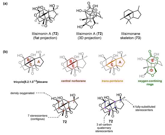 The structure of illisimonin A (72) was published by Ma and coworkers in 2017, who isolated the pentacyclic sesquiterpene from the fruits of the plant Illicium simonsii [21]. Its discovery marked a novel extension of the structural scope known to Illicium-derived sesquiterpenes with the natural product featuring the unpreceded illisimonane backbone (73) (Figure 7a), which combines a norborane (rings B and C) and trans-pentalane substructure (rings A and C), making it significantly strained. The backbone is further bridged by a γ-lactone and γ-lactol ring (rings D and E), which contribute to the cage-like structure of the molecule (Figure 7b).