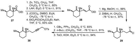 In the beginning, ketoester 27, which was derived from ethyl 2-cyclohexanonecarboxylate in two steps, was transformed into aldehyde 29. After a Corey–Fuchs reaction and an in situ trapping of the alkynyl anion with formaldehyde, the resulting propargylic alcohol was treated with TsCl to afford tosylate 30 [4] (Scheme 5).