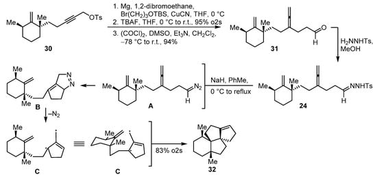 Allenyl aldehyde 31 was generated by reacting tosylate 30 with the Grignard reagent Br(CH2)3OTBS in a copper(I)-catalyzed SN2′ reaction, followed by cleavage of the TBS-ether and Swern oxidation of the liberated alcohol. After 12 steps and with allenyl aldehyde 31 in hands, the stage for the key step tandem cycloaddition reaction was set. Subjecting tosylhydrazone 24 to sodium hydride led to the formation of the corresponding diazo compound A, which would initiate the first [3 + 2]-cycloaddition, giving B as an intermediate species. The loss of nitrogen then generated the TMM diyl intermediate D, which underwent the second [3 + 2]-cycloaddition to build up 32 as the major product alongside other isomeric products (Scheme 6). In sum, this transformation not only assembled the angular triquinane moiety but also set two all-carbon quaternary stereocenters [4].