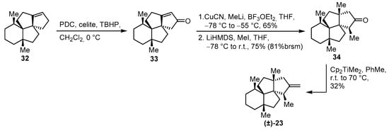 For the completion of the synthesis, the introduction of two methyl groups and the exo-methylene group was required. For this, enone 33, which was derived from tetracycle 32, was subjected to the addition of a higher-order cuprate to the less hindered α-face. The last stereocenter was constructed by regioselective enolate formation using LiHMDS and subsequent methylation of this α-position, yielding tetracyclic ketone 34 as a single isomer. Eventually, the exo-methylene group was installed via Petasis olefination to complete the first total synthesis of (±)-waihoensene (23) [4] (Scheme 7).