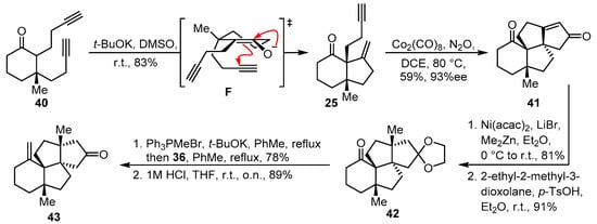 Exposing diyne 40 to catalytic amounts of t-BuOK initiated a diastereoselective Conia-ene-type cyclization, affording enyne 34 as a single diastereomer. At this stage, two of the four contiguous all-carbon quaternary stereocenters are set. With Co(CO)8 and nitrous oxide, enyne 25 underwent a Pauson–Khand reaction to afford the corresponding cyclopentenone 41, thus having assembled the tetracyclic framework containing the angular triquinane. To generate the only remaining all-carbon quaternary stereocenter, a Ni-catalyzed diastereoselective conjugate addition using Ni(acac)2 and Me2Zn was employed. Next, a Wittig reaction of mono-ketal 42 and subsequent treatment with hydrochloric acid gave tetracycle 43 with all four all-carbon quaternary centers in place [5] (Scheme 9).