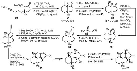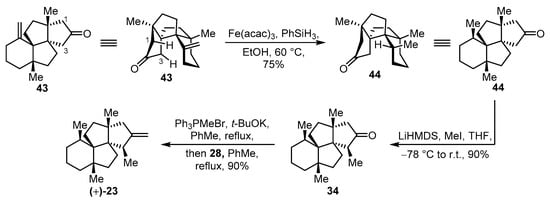 At this point, tetracyclic enone 33 is the key intermediate of Lee’s total synthesis, and the following known steps were carried out to give tetracyclic ketone 34. Eventually, the synthesis of (+)-waihoensene (23) was completed by making use of the earlier applied Wittig protocol, by which the final step was optimized in yield [6].