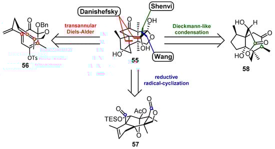 Pentacycle 69 was closed via a palladium-catalyzed 5-endo en-yne-cylization, which, as a side effect, simultaneously cleaved benzyl ether to obtain aldehyde 57. The last desired C-C bond was formed by a transannular Cp2Ti(III)Cl-mediated pinacol-type coupling of an aldehyde and a lactone carbonyl to free lactol 70. Acetic TES-deprotection and hydrogenation of the trisubstituted double bond furnished α-hydroxy ketone 71. The endgame was a samarium(II)iodide-mediated α-deoxygenation of hydroxyketone 71 to finish the synthesis. Starting from Danishefky’s enone 63 [19,20], Wang and coworkers synthesized (±)-11-O-debenzoyltashironin (55) in a sequence of 14 steps [7].