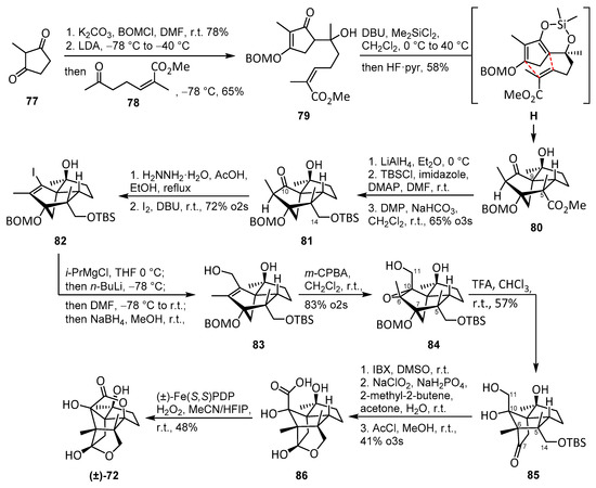 Diels–Alder precursor 79 was prepared from cyclopentadienone 77 and underwent the desired cycloaddition to tricyclic key intermediate 80 upon treatment with DBU and dimethyldichlorosilane. The intermediately formed 1,3-dioxa-2-silacyclohexane moiety of H thereby excellently templated the facial selectivity of the cycloaddition to stereoselectively build up the two all-carbon quaternary centers at C-5 and C-9 (Scheme 16) [8].