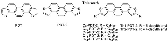 We previously reported the synthesis of phenanthro[1,2-b:8,7-b’]dithiophene (PDT) via Suzuki-Miyaura coupling of 3-formyl-2-thienylboronic acid with 1,4-dibromobenzene, followed by epoxidation and Lewis acid-catalyzed regioselective cycloaromatization (Figure 1, left) [48]. The introduction of two n-dodecyl groups into PDT (C12-PDT) along the longitudinal direction of the molecular axis showed a high crystallinity of its thin-film, resulting in a mobility as high as 2.2 cm2 V−1 s−1, i.e., higher by one order of magnitude than that of the parent PDT thin-film FET (1.1 × 10−1 cm2 V−1 s−1) [49]. This synthetic protocol can also be applied to the synthesis of the isomer of PDT, phenanthro[2,1-b:7,8-b’]dithiophene (PDT-2) (Figure 1, center). Likewise, the synthesized 2,7-didodecyl-substituted PDT-2 (C12-PDT-2) exhibited higher hole mobility, i.e., as high as 5.4 cm2 V−1 s−1, than that of C12-PDT, with a high-k gate dielectric [50]. This may be attributed to its favorable HOMO and HOMO−1 (hereafter NHOMO) geometries. To improve the hole mobility of PDT-2 derivatives, we reasoned that the introduction of a different array of alkyl or decylthienyl groups at 2,7-positions of the PDT-2 core may control crystallinity, solubility, and HOMO energy level, leading to improved transistor properties. We herein report the design, synthesis, and physicochemical properties of a series of 2,7-disubstituted PDT-2 derivatives (Figure 1, right).