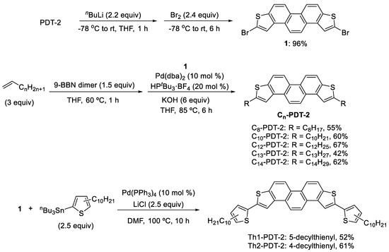 The synthetic route of the target PDT-2 derivatives is shown in Scheme 1. We treated PDT-2 [50] with n-butyllithium, followed by the addition of bromine, resulting in 2,7-dibrominated PDT-2 1 in 96% yield. Successively, five types of 2,7-dialkylated PDT-2 (Cn-PDT-2: n = 8, 10, 12, 13, and 14) were synthesized in 42–67% yields by Suzuki-Miyaura coupling of 1 with various alkylboranes, derived from hydroboration of terminal alkenes and 9-BBN dimer. Additionally, using the Pd-catalyzed Migita-Kosugi-Stille coupling reaction, 1 was reacted with (5-decylthiophen-2-yl)- or (4-decylthiophen-2-yl)tributylstannane, resulting in the desired products, Th1-PDT-2 and Th2-PDT-2 in 52% and 61% yields, respectively.