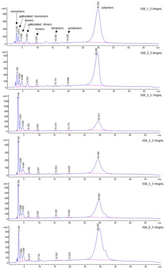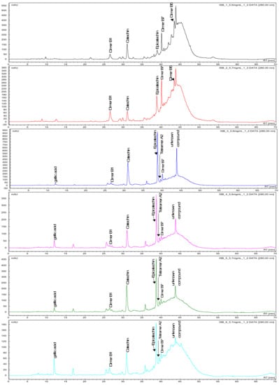 Proanthocyanidins (PAs), such as monomers (catechin, epicatechin, gallocatechin, epigallocatechin, epigallocatechingallate), dimeric procyanidins (B1, B2, B5, B7) galloylated dimeric procyanidins, trimeric procyanidins, galloylated trimeric procyanidins, tetrameric to hexameric procyanidins as well as gallic acid, caffeic acid and quercetin were detected in the ‘Isabel’ grape seeds, investigated in the present study, using LC-MS/MS and identified as described by Cádiz-Gurrea et al. [30] and Pantelić et al. [31] (Table 2). The corresponding HPLC-chromatograms of the seed polyphenols at different development stages of ‘Isabel’ grape at 280 nm with the main proanthocyanidins are shown in Figure 1 and Figure 2.