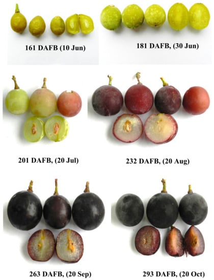 Grape berry development can be divided into three growth stages; an increase in pericarp and seed cell numbers (stage I), the development of the seed embryo and hardening of the seed coat (stage II) and the ripening stage (stage III) characterized by rapid accumulation of sugars. The inception of stage III, known as veraison (onset of ripening or change of color in the grape berries), is also characterized by berry softening in parallel with anthocyanin accumulation (red varieties). At this stage most of the seeds are fully developed. Rapid accumulation of anthocyanins has been reported in veraison [3,4,5,6,7,8,9,10,11,12,32].