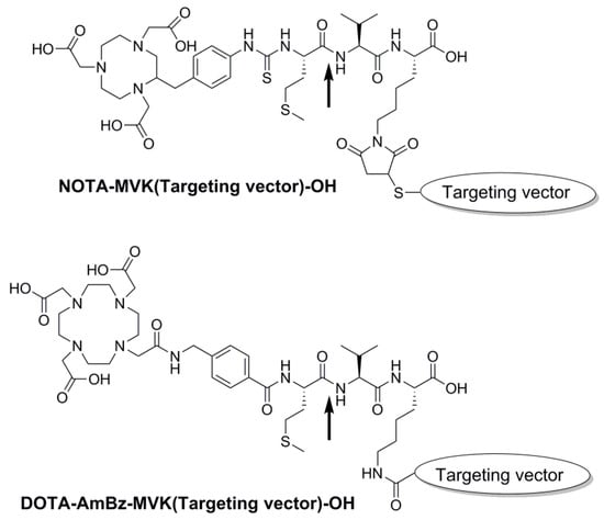 In this study, we evaluated the MVK sequence as a cleavable tripeptide linker to reduce renal uptake of radiolabeled DOTA-conjugated peptides and peptidomimetics. We modified the original design, NOTA-MVK(Targeting vector)-OH, reported by Uehara et al. [12], and replaced the NOTA chelator with DOTA for potential radiolabeling with both imaging and radiotherapeutic isotopes (Figure 1). We also inserted an aminomethylbenzoyl (AmBz) group between DOTA and the MVK sequence to mimic the aminobenzyl group in the original design. The maleimide-thiol linkage at the Lys side chain was replaced with an amide linkage to enable the facile synthesis of the DOTA-conjugated peptides on solid phase.