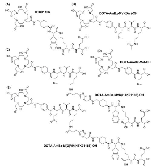 Chemical structures of (A) HTK01166, (B) DOTA-AmBz-MVK(Ac)-OH, (C) DOTA-AmBz-MVK(HTK01166)-OH, (D) DOTA-AmBz-Met-OH, and (E) DOTA-AmBz-M(O)VK(HTK01166)-OH.