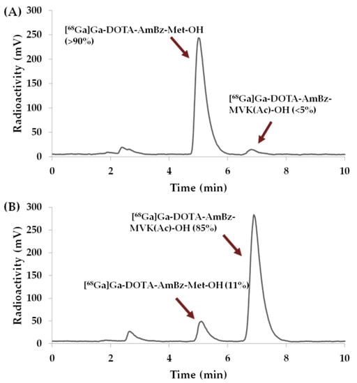 Radio-HPLC chromatograms of in vitro enzyme assay samples of [68Ga]Ga-DOTA-AmBz-MVK(Ac)-OH (A) without and (B) with the presence of phosphoramidon. HPLC conditions were 82/18 A/B at a flow rate of 2 mL/min; A: H2O containing 0.1% TFA; B: CH3CN containing 0.1% TFA; HPLC column: Luna C18, 5 µm particle size, 100 Å pore size, 250 × 4.6 mm.