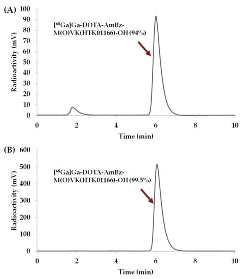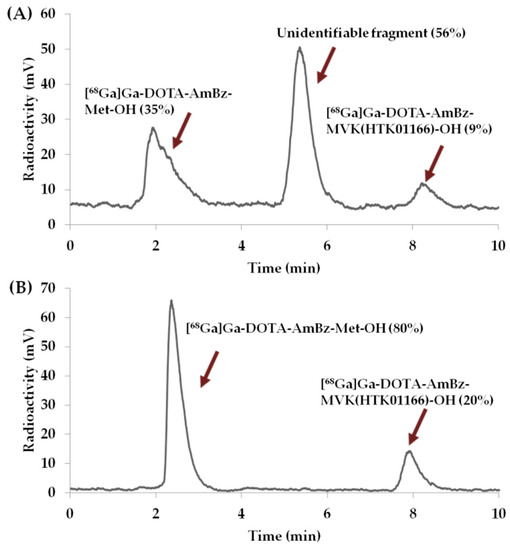 Radio-HPLC chromatograms of in vitro enzyme assay samples of [68Ga]Ga-DOTA-AmBz-M(O)VK(HTK01166)-OH (A) without and (B) with the presence of phosphoramidon. HPLC conditions were 76/24 A/B at a flow rate of 2 mL/min; A: H2O containing 0.1% TFA; B: CH3CN containing 0.1% TFA; HPLC column: Luna C18, 5 µm particle size, 100 Å pore size, 250 × 4.6 mm.