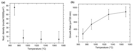 Analysis plots showing (a) nucleation density versus growth temperature, (b) nucleus growth rate versus growth temperature (reprinted with permission from [78]).
