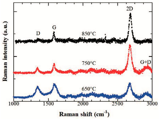 Dapthon and Chaisitsak studied the effect of growth temperature on CVD graphene growth, using a range of 650–950 °C [79]. The graphene quality was characterised by the obtained Raman spectra and analysing the peaks’ intensity ratios of I2D/IG and ID/IG. The highest graphene quality was obtained at a growth temperature of 850 °C with I2D/IG of 7.45 and ID/IG of 0.35 and narrow full-width-half-maximum (FWHM) of Lorentzian-shaped 2D peak of 38.88 cm−1 which are consistent with high-quality monolayer graphene with low defects density. Conversely, the lowest growth temperature resulted in a thick and highly defected graphitic film with I2D/IG of 0.68 and ID/IG of 0.76. Furthermore, the graphene grain size drastically decreased at lower growth temperature (La = 22.18 nm at 650 °C) compared to the ones obtained at a higher temperature (La = 47.51 nm at 850 °C), this is shown in Figure 8.