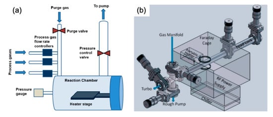 CVD is the technique of depositing material onto substrates from vapour species through chemical reactions. In CVD, the reactive gases are fed from cylinders into the reactor through a gas delivery system. The gas delivery system contains the valves, mass flow controllers (MFCs) and the gas-mixing unit, which mixes the different gases according to their required ratios before they enter the reactor. The reactor (reaction chamber) is where the chemical reaction takes place and where the products are deposited on substrates. Heating elements surround the reaction chamber, thus providing the necessary temperatures for the reaction to occur. The pressure is achieved as low or atmospheric pressure in the reactor by using either a pump for the evacuation of the reaction’s tube or a unidirectional relief valve to maintain atmospheric pressure inside the reactor. Finally, the by-products of the reaction and the non-reacted gases are removed by the gas delivery system through the exhaust (Figure 2) [27].