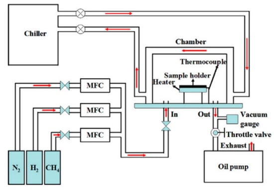 A significant part of publications on the cold wall CVD process is devoted to the effect of various process parameters on the growth of graphene. Sarno et al. successfully obtained a graphene film on a Cu foil using the cold wall CVD method, which was then transferred to a SiO2/Si and polyethylene terephthalate (PET) substrates [83]. In their attempts to obtain ordered graphene, the authors investigated the effect of various modifications to the operating conditions, including the following: increased synthesis time (for the more complete the graphene coverage); increased pretreatment time (to facilitate the formation of Cu grains of needed size); optimisation of the low-pressure vacuum conditions (to control chemical reaction, promote stream diffusion and decrease material flow); and altering the gas flow rates, such as the concentration of diluent gas as they reduced the argon flow rate (to increase the C-conversion rate and reduce partial pressure of CH4). Similar to the effect of growth substrate in hot-wall CVD, the increase of the Cu grain size and the uniform crystallographic orientation of the surface were established to be key factors affecting the growth of graphene films by cold wall CVD and their quality. Furthermore, according to the author’s estimations, a prominent advantage of the proposed cold wall CVD technique is the significantly reduced energy costs due to much shorter synthesis times (6−12 min) and low vacuum conditions (1.1 × 10−2 bar) [83]. Chang et al. demonstrated the feasibility of a resistively heated stage (pyrolytic graphite/pyrolytic boron nitride) cold wall CVD for the synthesis of single-layer and few-layer graphene sheets on Ar plasma treated Cu and Ni foils using CH4 as a gaseous precursor. The work concludes that, although graphene films deposited on Ni foil are similar to films deposited on a Cu substrate, they are characterised by a higher number of defects [86]. Huang et al. successfully prepared high-quality graphene films in the cold wall CVD system with a rapid thermal processing heater using the Ni foil as the metal substrate, which was heated in the pyrolytic graphite/pyrolytic boron nitride heater up to a temperature of 1000 °C at a heating rate of 100 °C/min for 30 min in the gaseous atmosphere consisting of N2 and H2 (schematic diagram of the used system is illustrated in Figure 10). The article concludes that the growth time directly affects the quality of graphene films and that their sheet resistance and optical transmittance increase significantly with the decreasing concentration of H2 [87].