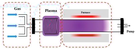 Plasma-enhanced CVD (PECVD) is a method for graphene growth with the ability to grow graphene at a lower temperature with better control in the nanostructure, faster growth and higher selectivity producing more ordered/patterned materials [93]. In this technique, the plasma, the fourth state of matter, can generate species which are more reactive than ground-state atoms or molecules such as excited molecules and ions, photons, free radicals and energetic electrons at low or atmospheric pressure [94] that can dissociate the gas carbon source at relatively low temperatures in addition to lowering the energy barriers for nucleation and growth process in CVD. Moreover, PECVD induces the graphene growth on dielectric substrates rather than on the surface of the catalytical metal substrate, protecting the graphene from contamination and structural defects which might occur in the graphene transfer process and hence reduce its performance in electronic applications. [95]. There are three main parts in the experimental setup of PECVD, including gas, plasma generator and vacuum heating chamber. The general setup for PECVD is presented in Figure 11 [95].