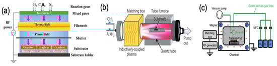 Combining radio frequency (RF) plasma with additional heat of a hot filament, (Figure 13a) was used to synthesise graphene directly on Ni substrate without requiring annealing step, the hot filament led to an increase in Ni grain size from nano to micro-scale and reducing the Ni grain boundaries formation which led to the growth of graphene of more ordered structure with less defects. Moreover, the high temperature eliminated oxygen contamination in the Ni catalyst and enhanced the electrical properties of the film [105]. Hot filament RF-PECVD (HF-RF-PECVD) was also used in direct growth of nitrogen-doped graphene films on glass substrate using eco-friendly N dopant by N2 gas instead of NH3 where the latter is considered as an environmental pollutant due to its corrosion ability and toxicity, and it also might cause damage to the CVD system [106]. B-doped graphene glass was also prepared by the same method using diborane (B2H6) as the B dopant.
