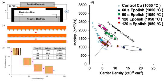 Schematic of (a) EP setup and (b) planarization mechanism during polishing. (c) AFM images showing as received Cu compared to EP Cu using different EP times. The inset table displays the measured surface roughness of the EP samples over time and the reduction rate from the as-received sample (reprinted with permission from [130]); (d) a plot of mobility versus carrier density of CVD grown graphene on EP Cu (reprinted with permission from [131]).
