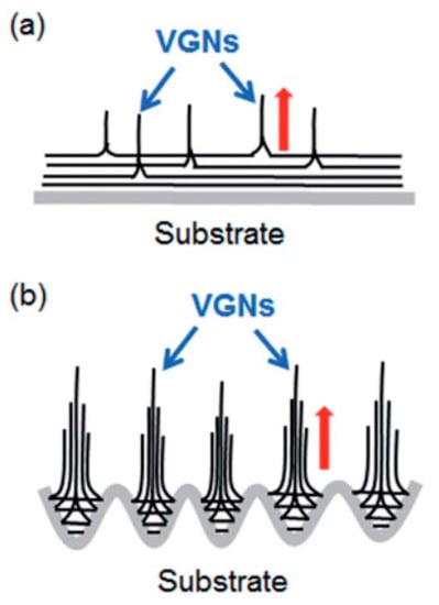 Scheme for the mechanism of VGN growth on (a) untreated and (b) Ar plasma-treated substrates (reprinted with permission from [132]).
