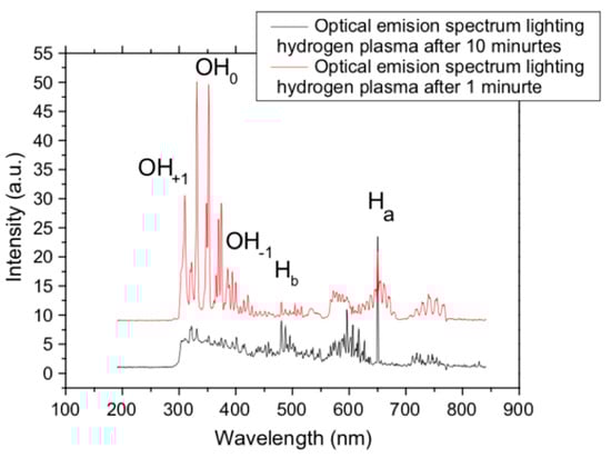 OES of the Cu reduction after 1 and 10 min of the exposure to hydrogen plasma, showing the reduction of the OH peaks that indicates the reduction and removal of the native oxide layer on the surface of Cu substrate (reprinted with permission from [77]).