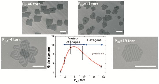 Hussain et al. studied the effect of hydrogen in LPCVD on graphene growth [64]. Their results determined the effect of hydrogen on the physical and electrical properties of the grown graphene. Higher hydrogen flow rates led to an increase in the grain growth, while graphene using lower hydrogen flow rates exhibited higher surface contamination due to more oxygen-related functional groups (e.g., amorphous and oxides carbon) [64].