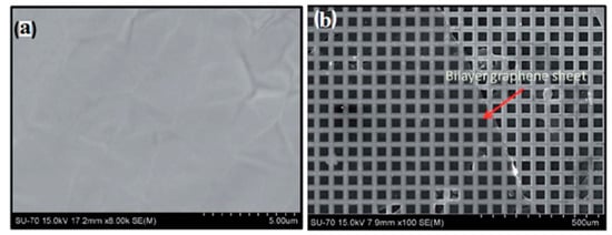 The quality of the deposited graphene was reported to be highly improved and become more uniform by using a Cu substrate with a thin layer of evaporated Cu on the surface (200 nm). This suggested that the precise evaporation of this Cu thin film enhances the smoothness of the growth substrate that reflects on the uniformity of the produced graphene [126]. Moreover, it was shown that the substrate’s orientation and pre-annealing strongly affect the thickness uniformity of the grown graphene [127]. It was claimed that forming a smooth Cu (111)-oriented surface during pre-annealing leads to the formation of monolayer graphene with improved uniformity and nearly perfect centimetre-scale samples [127]. Another substrate treatment that modifies surface morphology is using nitric acid for etching the as-received Cu foil using short exposure time (30 s) showing that it improves the quality of the produced graphene film [128]. The effect of using nitric acid was also reported by Kim et al. when Cu foil was annealed first under the flow of hydrogen, followed by etching using nitric acid. It was found that pre-annealing under H2 removed the native Cu oxide where the nitric acid removed the rolling lines and impurities, providing a smoother surface for graphene deposition. It was found that pre-treated Cu foil exhibited 98.3% of the grown graphene as monolayer compared to 75% of monolayer graphene on untreated substrates [129].