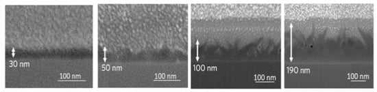 In addition, the effect of substrate’s treatment using Ar plasma was studied by Sui et al. reporting its effect on the growth of vertically oriented graphene (VOG) via PECVD involving etching by hydrofluoric acid (HF) and oxidation by oxygen gas after Ar plasma treatment. They showed that carbon precursors are slightly adsorbed on the untreated substrate forming planar nanoflakes with less probability for the growth of VOG. However, Ar plasma-treated substrates can create a microcavity on the substrate surface, which are considered to be active growth sites. According to Stranski–Krastanov growth model [132]. The strain accumulation of VOG is decreased on the rough surface of Ar plasma-treated substrates, resulting in the transformation of 2D planar films to the 3D cluster, as illustrated in Figure 16. Oxidation of the substrate after HF etching resulted in more dense formation of VOG due to the passivation of Ar plasma by the oxidation.