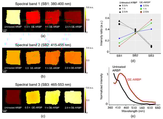 Intensity ratios were obtained dividing the fluorescence intensity of each SB to the summation of fluorescence intensities in all three measured SBs. Figure 2a–c show the fluorescence intensity ratio maps of the GE cross-linked samples in the three SBs. Intensity ratios are indicative of the spectral properties of the samples. Similar to fluorescence lifetimes, intensity ratios can monitor cross-linking at different time points. In SB1, the mean fluorescence intensity ratio decreased from 0.53 (untreated ARBP) to 0.24 a.u. in 0.5 h of incubation with GE, 0.16 a.u. at 1 h, and to 0.1 at 2.5 h. In SB2, the intensity ratio also decreased with increasing cross-linking incubation time, however, the differences with the untreated ARBP were unremarkable in all time points. In SB3, the mean fluorescence intensity ratio increased with increasing GE incubation time. Untreated ARBP had a mean intensity ratio of 0.08 a.u. and it increased to 0.41 a.u. at 0.5 h, to 0.51 a.u. at 1 h, and to 0.57 a.u. at 2.5 h GE cross-linking. Overall, a redshift was observed upon GE cross-linking (Figure 2d). This spectral shift progressed over the incubation time, being more pronounced on the last tested time point. The emission spectra of ARBP and GE cross-linked (at 2.5 h) confirmed the redshift (Figure 2e). Upon 355 nm excitation, untreated ARBP exhibited a maximum fluorescence emission at 390 nm, whereas the peak for GE-ARBP (2.5 h) was at 440 nm.