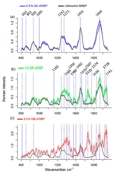 The Raman difference spectra for each time point (0.5, 1, and 2.5 h) were calculated by subtracting the GE-ARBP spectrum with the untreated ARBP spectrum. The mean and standard deviation were calculated from all collected spectra.