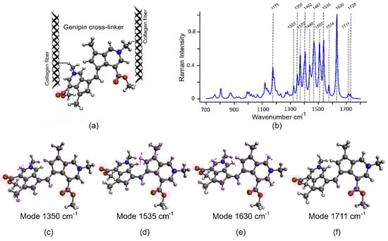 (a) Genipin cross-linker. (b) DFT-simulated Raman spectra of genipin cross-linker. Prominent Raman vibrational modes of genipin cross-linker: (c) mode 1350 cm−1, (d) mode 1535 cm−1, (e) mode 1630 cm−1, and (f) mode 1728 cm−1. Atom notation—blue: nitrogen, grey: carbon, red: oxygen, light grey: hydrogen.