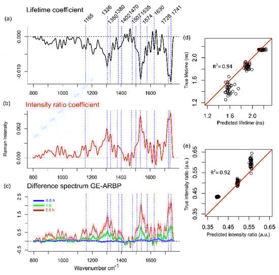 To increase the biochemical specificity of FLIm, we explored the relationship between the FLIm parameters and the Raman spectra of GE-ARBP with a multivariate multiple regression (mvmr). Two independent fluorescence variables, namely fluorescence lifetime and intensity ratios, were predicted from the Raman spectra yielding two correlation coefficients (Figure 5a,b). Of note, based on the FLIm results, SB3 better captured the effects of the GE cross-linker, thus this analysis was performed with the FLIm parameters obtained in SB3. Both coefficients showed prominent Raman bands at 1165, 1326, 1350, 1380, 1402, 1470, 1507, 1535, 1574, 1630, 1728, and 1741 cm−1. The intensity ratio coefficient had positive Raman bands consistent with an increase in intensity ratio with increasing GE cross-linking (Figure 2d). Conversely, the lifetime coefficient had negative bands at equivalent frequencies consistent with lifetime decreases with increasing GE cross-linking (Figure 1f). The Raman difference spectra between GE-ARBP at different time points and their corresponding ARBP untreated control are shown in Figure 5c. These mimic the coefficients of the model having equivalent bands to those arising due to GE cross-linking, which serves as evidence that the changes in the fluorescence lifetime and intensity ratio of GE-ARBP observed in SB3 are mainly due to the GE cross-linker. The mvmr model could predict lifetimes and intensity ratios of test data with an R2 = 0.94 (Figure 5d) and R2 = 0.92 (Figure 5e), respectively.