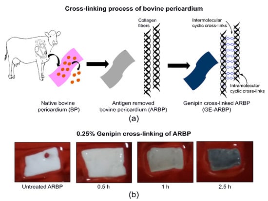 Bovine pericardium (BP) (Spear Products, Coopersburg, PA, USA) was antigen-removed and decellularized [] and frozen at −80 °C until use. For the genipin cross-linking experiment, strips of antigen-removed bovine pericardium (ARBP) were thawed and further cut into 12 pieces of about 1 × 1 cm. The experimental procedure is depicted in Figure 6a.