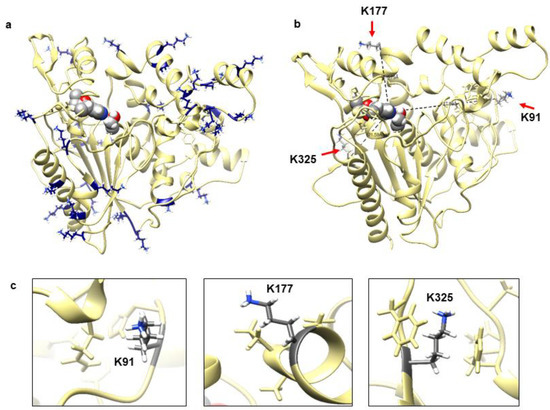 Figure 1a shows that this lipase adopted an α/β hydrolase fold and a lid domain, which is commonly exhibited by lipase in superfamily of α/β hydrolases [21]. The overall three-dimensional (3D) structure is formed by 19 α-helices and nine β-strands; and conserved sequence motifs GHSMG include highly conserved Ser116, catalytic residue Asp307 and His349. Highly conserved GXSXG pentapeptide motif in lipase include a serine and histidine that hydrogen bonded to a glutamate or aspartate to form a catalytic triad and oxyanion hole [22,23]. The distribution of charged residues particularly lysine is also shown in Figure 1a. Most of the lysine residues were clearly seen exposed to the protein surface and some on the loop regions. Figure 1b,c show the specific location of the targeted residues. Lys91, Lys177, and Lys325 were located remote from the catalytic triad with a distance of 27.80 Å, 16.79 Å, and 21.59 Å, respectively.