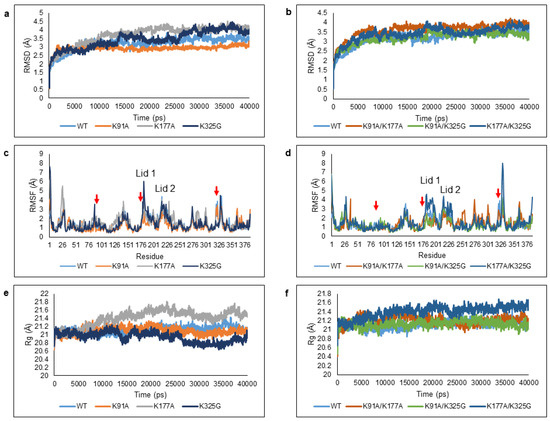 Deviations and fluctuations of the WT and mutant lipases when simulated in an aqueous environment. Trajectories of WT and mutant lipases were represented in different colour; (a,b) Root Mean Square Deviation (RMSD), (c,d) Root Mean Square Fluctuation (RMSF), and (e,f) Radius of gyration (Rg). The red arrows represent the position of K91, K177, and K325 in the RMSF graph.