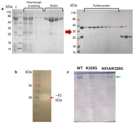 (a) SDS-PAGE (12%) analysis of two-steps purification of WT; (b) activity staining; and (c) native PAGE of purified WT, K325G and K91A/K325G. Symbols denote (C) crude enzyme, flow-through of impurities and washing step fractions. The elution fractions represented GST-tagged WT lipase (~69 KDa). GST tag was cleaved by PreScission Protease. Purified protein denotes purified WT (~43 KDa) shown by red arrow. GST tag was collected into later fractions (~26 kDa). A standard protein marker (Fisher Thermo Scientific, USA) was utilised. Activity staining with clearing zone on each purified mutant lipase (red arrows). Pre-stained protein ladder (Thermo Scientific, Waltham, MA, USA) was used as the marker. Native PAGE analysis showed a single protein band observed on the gel (shown by green arrow).
