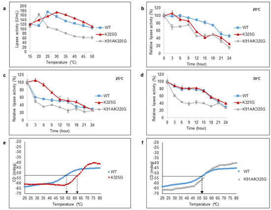 Effect of temperature on purified WT, K325G, and K91A/K325G lipase (a) activity and (b–d) half-life. Optimal temperature was determined by varying assay temperatures (15°C to 50°C). As for half-life, each lipase was incubated at different temperatures; 20 °C, 25 °C, and 30 °C for 24 h. The remaining activity was assayed at their optimal temperature. The protein concentration of each tested lipase was standardised to 0.5 mg/mL. Relative activity was calculated based on the control of the experiment. Non-incubated sample was regarded as the control (100%). Error bars denote the standard deviation of means (n = 3). Thermal unfolding (Tm) curve of the WT with (e) K325G and (f) K91A/K325G. Heating rate was 1°C min-1. The arrows indicate the point of thermal unfolding of each enzyme. Symbols represent as follows; (■) WT, (♦) K325G, and (▲) K91A/K325G.