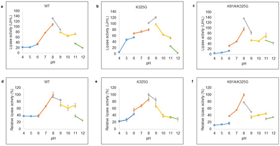 Effect of pH on lipase activity of purified (a) WT, (b) K325G, and (c) K91A/K325G. Optimum pH was identified by varying the pHs (4–12). Tested lipase was assayed at 25 °C for 10 min. The protein concentration of each tested lipase was standardised to 0.5 mg/mL. While, effect of pH on lipase stability of purified (d) WT, (e) K325G, and (f) K91A/K325G. The buffer systems used are as follows: sodium acetate (pH 4–6); sodium phosphate (pH 6–8); Tris-HCl (pH 8–9); glycine-OH (pH 9–11) and sodium hydrogen phosphate (pH 11–12). The purified lipase was pre-incubated at the tested pHs for 30 min. Relative activity was calculated based on the control of the experiment. Non-incubated sample as control (100%) were employed to calculate the relative activity. Error bars represent standard deviations of means (n = 3).