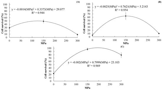 LP powders microencapsulated with 150 MPa-treated skim milk had significantly (p < 0.05) higher cell survival (%) than those microencapsulated with non-UHPH-treated and 300 MPa-treated skim milk (Figure 1A). Furthermore, the cell survival (%) of LP in powders prepared with 150 MPa-treated skim milk was 49.21 ± 5.31, which is 69% higher compared to powders microencapsulated with non-UHPH-treated skim milk (29.08 ± 4.23). Surprisingly, when 300 MPa-treated skim milk was used as microencapsulating agent, the cell survival of LP was reduced to 8.43 ± 2.96. To understand this effect better, an analysis of polynomial regression was developed (cell survival (%) = −0.0014 (MPa)2 + 0.3373 (MPa) + 29.077, R2 = 0.9438, P = 0.00007) which revealed a quadratic relationship between UHPH pressures (MPa) and cell survival (%). The regression model suggests that treating skim milk at UHPH pressures (up to ~150 MPa) increases its protective effect as microencapsulating agent for LP. However, after a certain point (~150 MPa) the intrinsic properties of skim milk are excessively modified and its protective properties as microencapsulating agent are slowly lost (denoted by the reduction of cell survival). The quadratic regression model was highly significant (p < 0.05) which indicates that it can be used to describe the relationship between UHPH pressures and cell survival of LP in the microencapsulated powders. These results clearly indicate that cell survival of LP after microencapsulation via CCSD can be improved by using UHPH-treated skim milk.