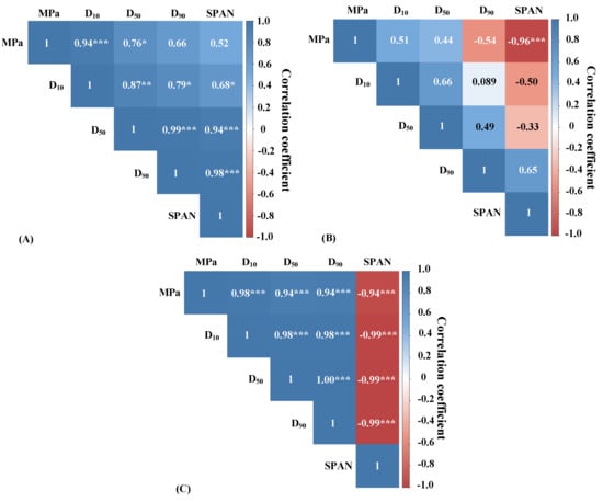 Pearson’s bivariate correlation analysis between particle size distribution values (D10, D50, D90, and span) and UHPH pressure level (MPa) for powders produced via CCSD (A), MXSD (B), and FD (C). Output numbers represent the correlation coefficients. The starts represent the p-value of the correlations: * p < 0.05, ** p < 0.01, *** p < 0.001.