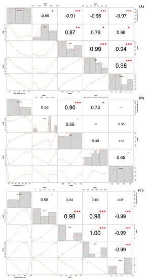 Highly negative correlations were observed between D50 (−0.91 ***) and span (−0.97 ***) of LP powders produced via CCSD vs. cell survival (Figure 3A). This suggests that higher survival rates are observed in smaller and less agglomerated CCSD powders. Meanwhile, a positive correlation (0.90 ***) between D50 vs. cell survival in LP powders produced via MXSD (Figure 3B) was seen thereby suggesting that bigger MXSD powders had higher cell survival. Less surprisingly, no correlation was found between the particle size of powders produced via FD and cell survival (Figure 3C).
