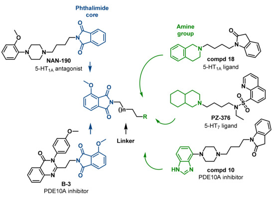 General structure of novel compounds 3–23, designed based on potent phosphodiesterase 10A (PDE10) inhibitors and active serotonin receptor ligands [20,25,26,28,29,30]. The phthalimide cores and amine groups are highlighted in blue and green, respectively.