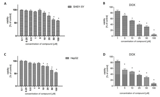 Viability of SHSY-5Y and HepG2 cells treated with compound 18 in the MTT test; doxorubicin (DOX) was used as reference control. (A): compound 18 (SHSY-5Y), (B): DOX (SHSY-5Y), (C): compound 18 (HepG2), (D): DOX (HepG2). Graphs represent the viability of cells as a % of control (non-treated cells). Values represent means ± SEM of three independent experiments. Statistical significance (*) vs. control was determined using the Mann-Whitney test, p < 0.05.